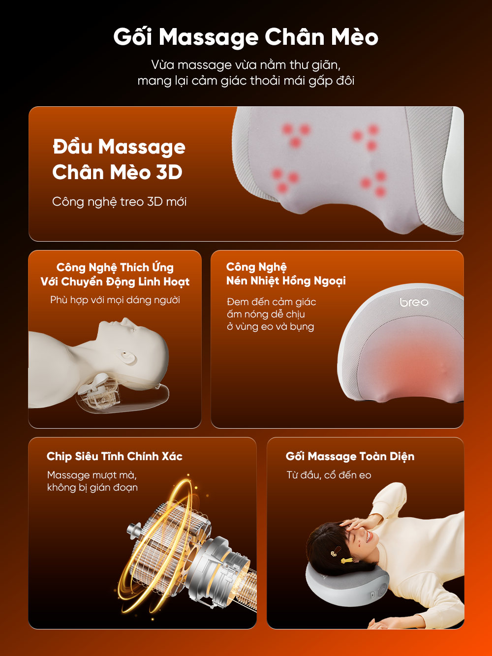 Gối massage BREO P2 không chỉ giảm đau tức thì mà còn góp phần cải thiện tư thế tổng thể, giảm stress và hỗ trợ giấc ngủ chất lượng hơn thông qua thư giãn cơ trước giờ nghỉ. Sản phẩm đặc biệt hiệu quả cho mọi lứa tuổi, từ người trẻ đến lớn tuổi. Để đạt kết quả tốt nhất, hãy bắt đầu với mức nhẹ nếu da nhạy cảm, tránh sử dụng trên vết thương hở và tham khảo ý kiến bác sĩ nếu bạn có vấn đề tim mạch hoặc đang mang thai nhé!