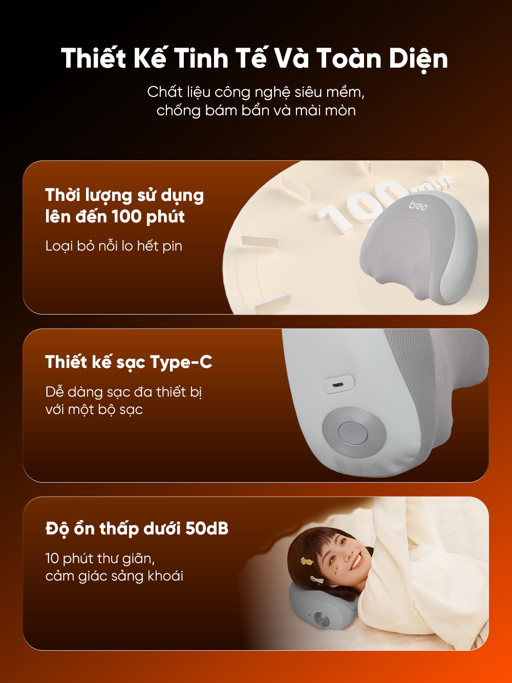 Pin và độ yên tĩnh tối ưu: Pin lithium-ion 2200mAh cung cấp thời lượng 100 phút, đủ cho 6-7 phiên sử dụng, với thời gian sạc nhanh 3.5 giờ. Máy vận hành êm ái dưới 50dB, không ảnh hưởng đến giấc ngủ hoặc không gian yên tĩnh.