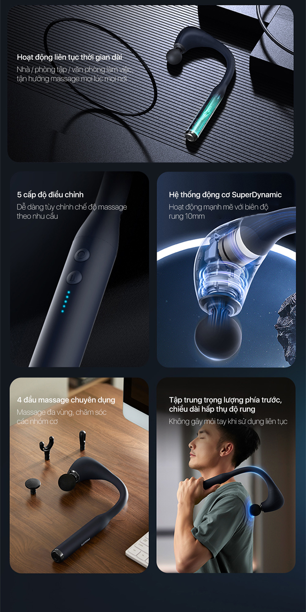 Thiết kế ergonomics vòng cung số 7 với tay cầm 360 độ linh hoạt: Kiểu dáng vòng cung hình số 7 độc quyền, kết hợp tay cầm xoay 360 độ và trọng lực nghiêng về phía trước giúp giảm áp lực lên cổ tay đến 50% khi sử dụng lâu. Thiết kế này tiếp cận dễ dàng vùng khó như lưng dưới hoặc eo cho khả năng massage tối ưu.