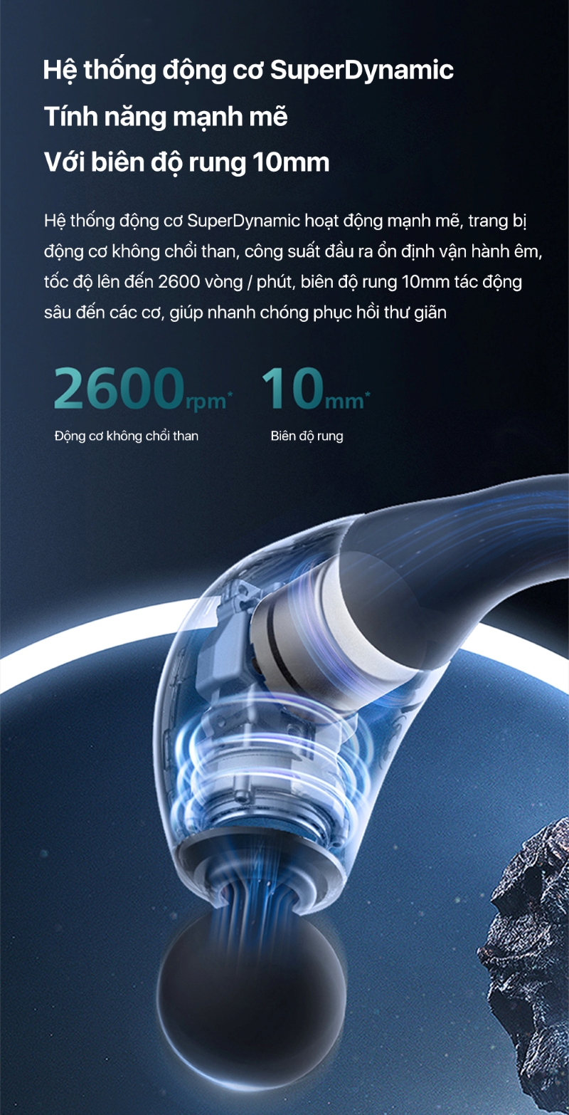 Công nghệ động cơ SuperDynamic không chổi than với biên độ rung 10mm vượt trội: Động cơ không chổi than tiên tiến của Philips tạo rung động mạnh mẽ ở tốc độ 2600 vòng/phút và biên độ sâu 10mm, xuyên thấu vào lớp cơ sâu để giải phóng căng thẳng tích tụ, mô phỏng chính xác động tác đập, nhào của chuyên viên massage - lý tưởng cho phục hồi cơ sau tập luyện hoặc giảm đau vai gáy do ngồi lâu.