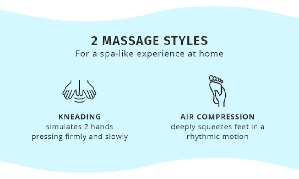 Hệ thống nén khí nhịp nhàng: Túi khí bơm nén và tạo sóng ép nhịp nhàng ôm sát toàn bộ bàn chân (từ mu bàn chân đến ngón chân), kích thích xoa bóp bấm huyệt một cách đều đặn. Đây là giải pháp được chuyên gia đánh giá cao về hiệu quả thư giãn tối đa cho đôi chân mệt mỏi, tê rần, giúp giảm phù nề.