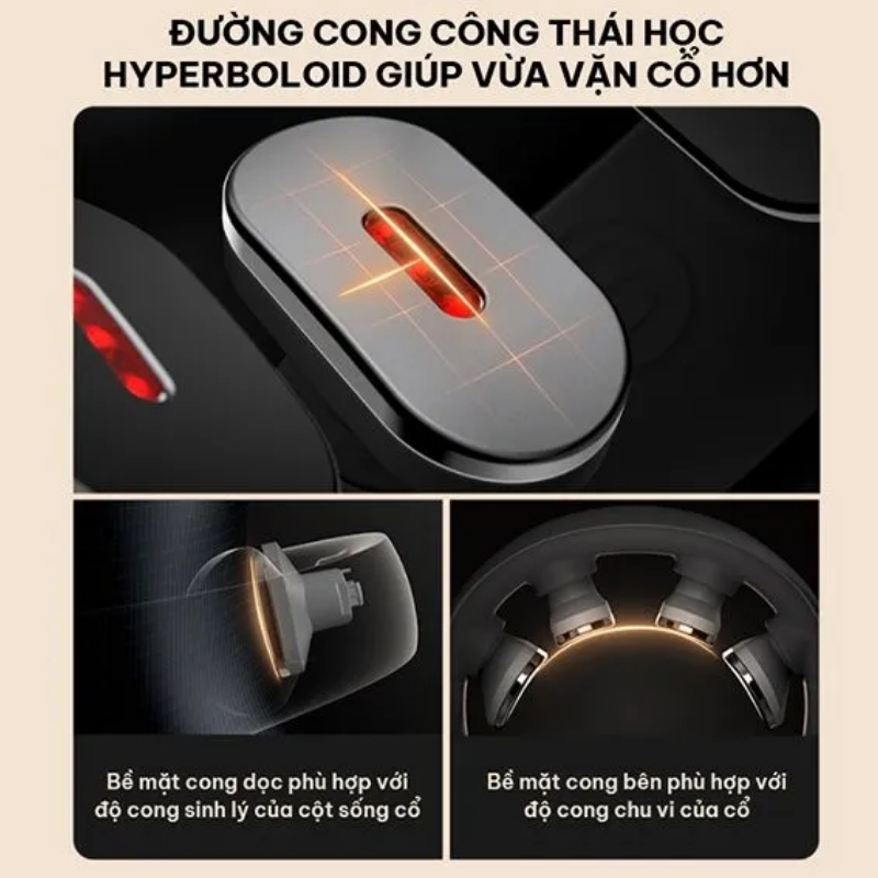 Thiết kế 3D ôm sát và tiện lợi tối đa: Hình dáng cong 3D ôm sát đường cong tự nhiên của vai cổ, với đầu massage thép không gỉ phân bổ lực đều, tránh áp lực lên cột sống. Trọng lượng siêu nhẹ chỉ 125g cho phép đeo thoải mái mọi lúc - tại văn phòng, khi lái xe hoặc trước giờ đi ngủ mà không gây khó chịu.