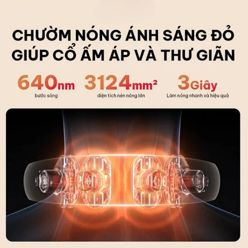 Chườm ấm hồng ngoại với ánh sáng đỏ 640nm: Hệ thống 12 hạt LED đỏ lan tỏa nhiệt đều (3 mức: nhanh nóng lên chỉ 3 giây), che phủ rộng 3124mm², mở rộng mạch máu và loại bỏ độc tố mà không gây bỏng. Khi kết hợp với EMS chức năng này đẩy nhanh tuần hoàn, giảm căng thẳng và đau đầu do mỏi cơ - lý tưởng cho người lớn tuổi hoặc mất ngủ. Nhiệt độ tự động ổn định, có thể dùng độc lập cho liệu pháp chườm đơn giản, mang lại cảm giác ấm áp thoải mái và ngăn ngừa cứng khớp hiệu quả.