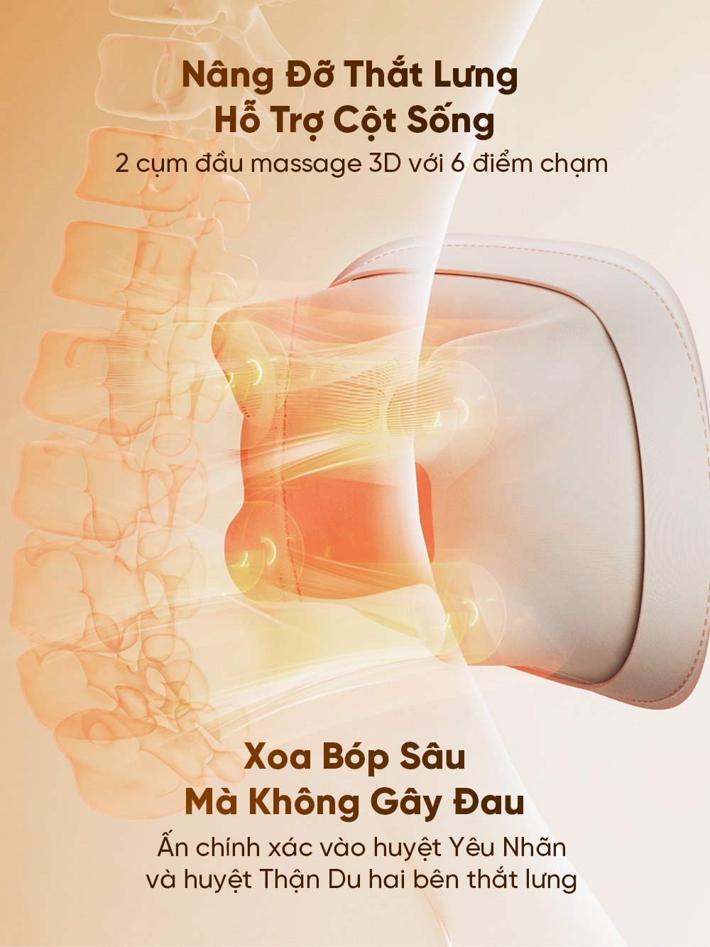 Công nghệ massage 3D với 6 điểm chạm mô phỏng ấn huyệt: Với 2 cụm đầu massage chuyên sâu, sản phẩm tái tạo kỹ thuật ấn huyệt truyền thống, tập trung vào các điểm then chốt vùng lưng và bụng. Massage 3D di chuyển đa chiều giúp nâng đỡ cột sống tự nhiên để giảm áp lực và giảm đau mỏi, đặc biệt hữu ích cho người ngồi lâu hoặc ngồi không đúng tư thế.